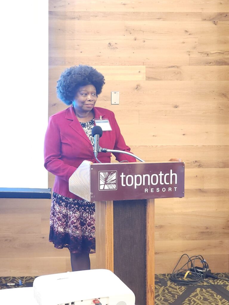 At left, she is pictured giving the Opening Presentation to the Vermont Medical Society’s Annual Collaborative Meeting in 2024.
